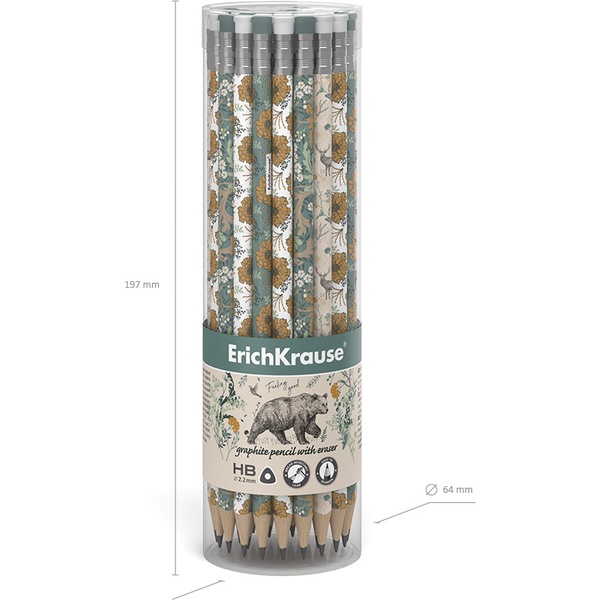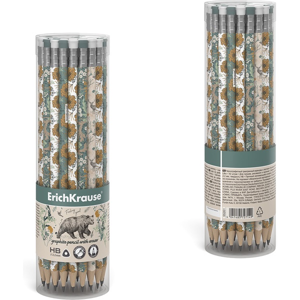 Карандаш чернографитный с ластиком, HB, деревянный, трехгранный, 4 дизайна, ErichKrause Natural Life