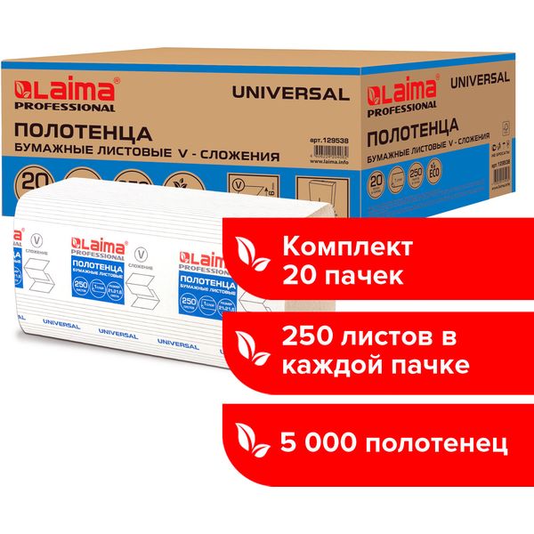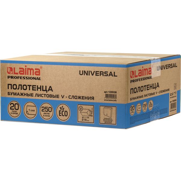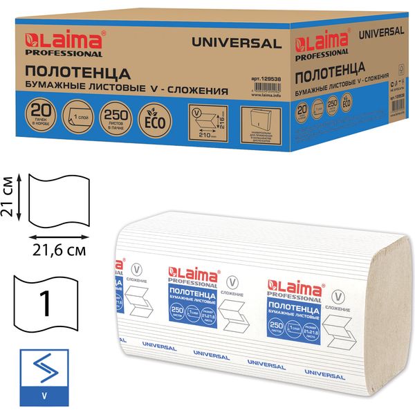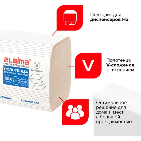 Полотенца бумажные 250 л., 1-сл., 210*216 мм, V-слож. (ZZ), нат. белые, LAIMA H3 Universal (20 пач.)