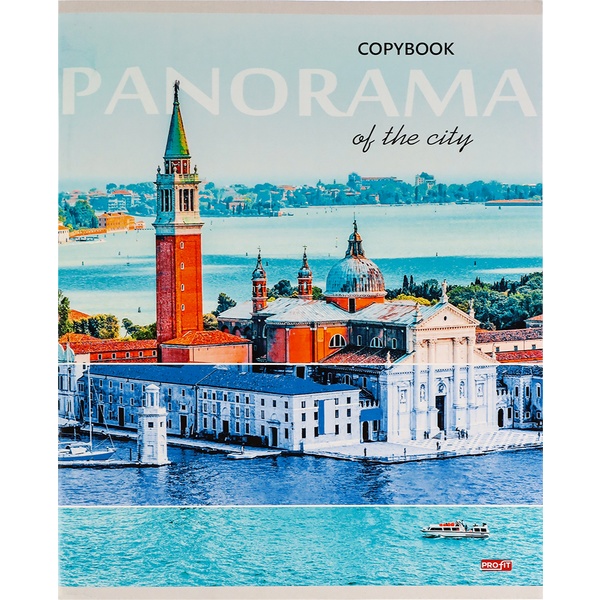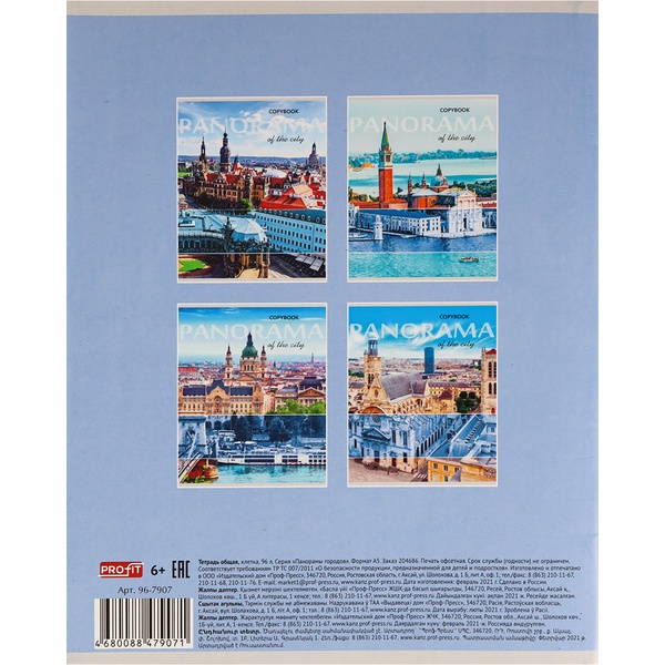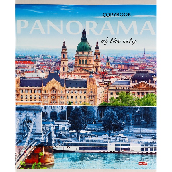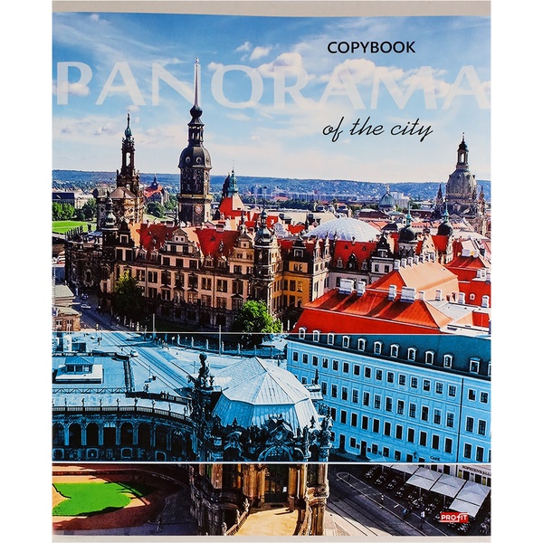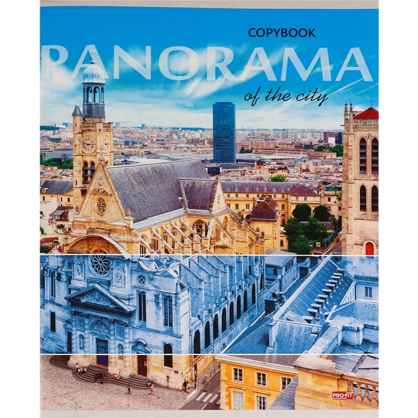 Тетрадь А5, клетка, 96 л., на скобе, 60 г/м², мел. бумага, Profit Панорамы городов_4 дизайна