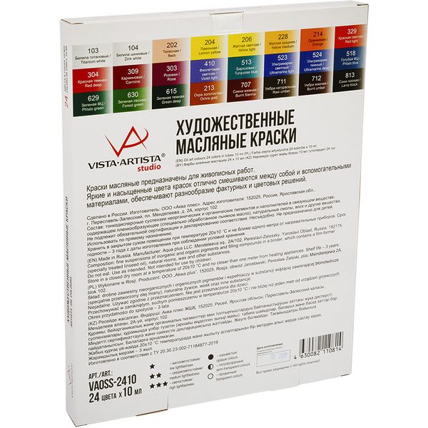 Краски масляные художественные VISTA-ARTISTA Studio, 24 цвета, туба 10 мл, картон. коробка