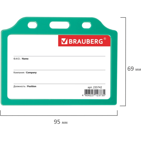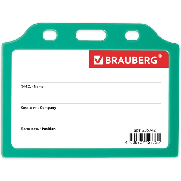 Бейдж без крепления BRAUBER, 55*85 мм, горизонтальный жесткокаркасный, без держателя, зеленый