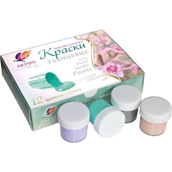 Краски акриловые художественные ЛУЧ, 12 цветов (пастельные, глянцевые), банка 20 мл, в к/к