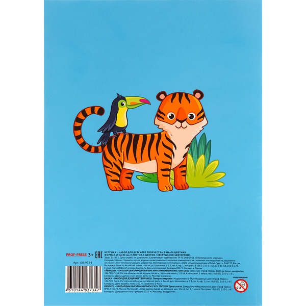 Бумага цветная мелованная 8 цв., 8 л., А4, 1-ст., 50 г/м², на скобе, Prof-Press Зверушки из джунглей