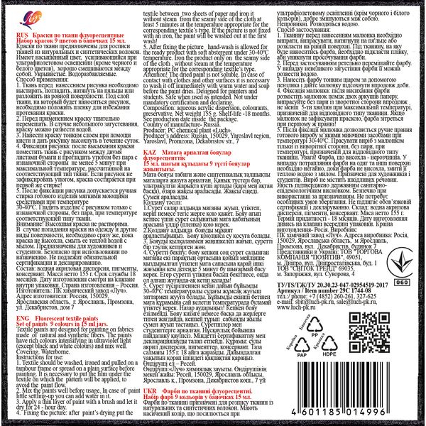 Краска по ткани в наборе ЛУЧ, 9 цветов, акриловая флуоресцентная, банка 15 мл