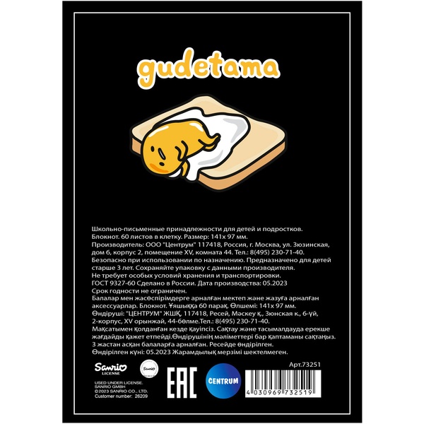 Блокнот на гребне А6, 60 л., клетка, 60 г/м², CENTRUM Gudetama   Акция!